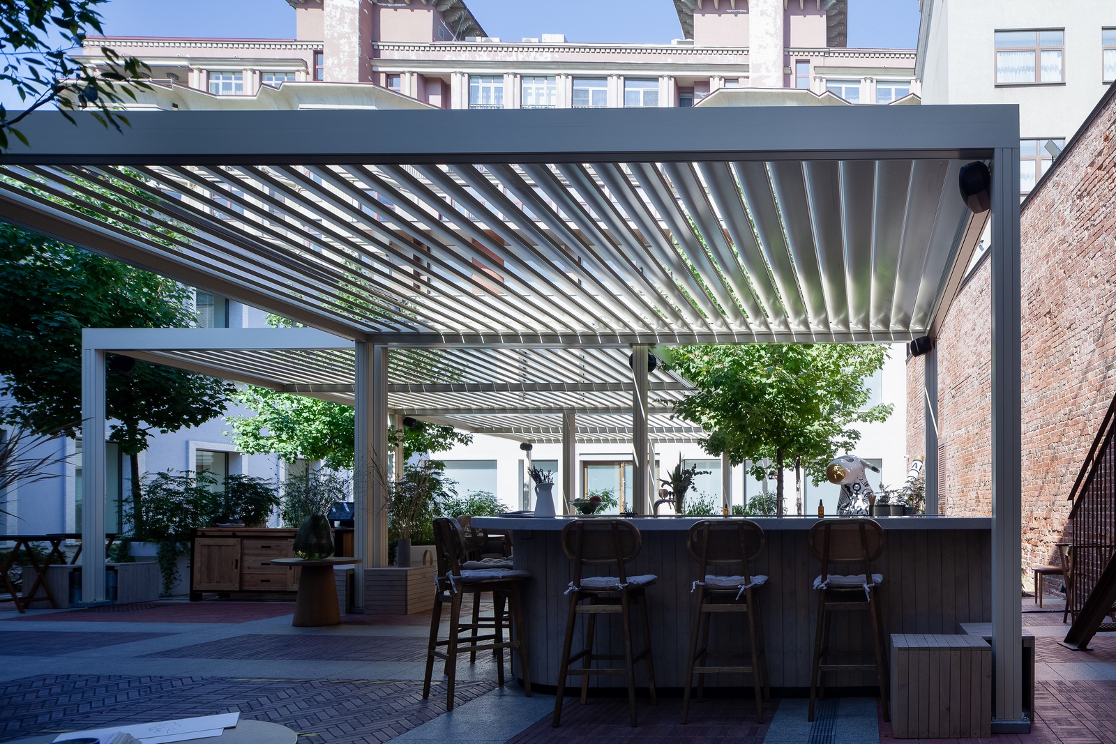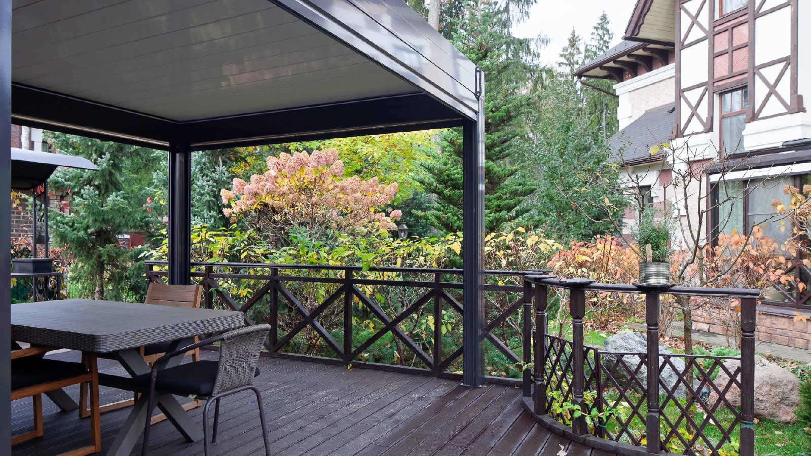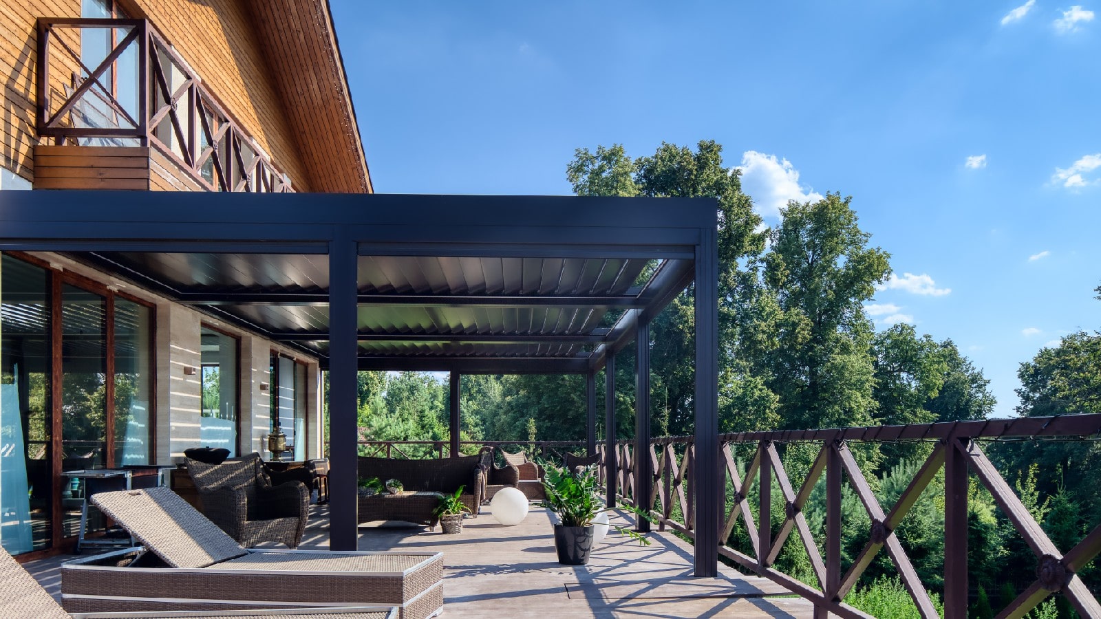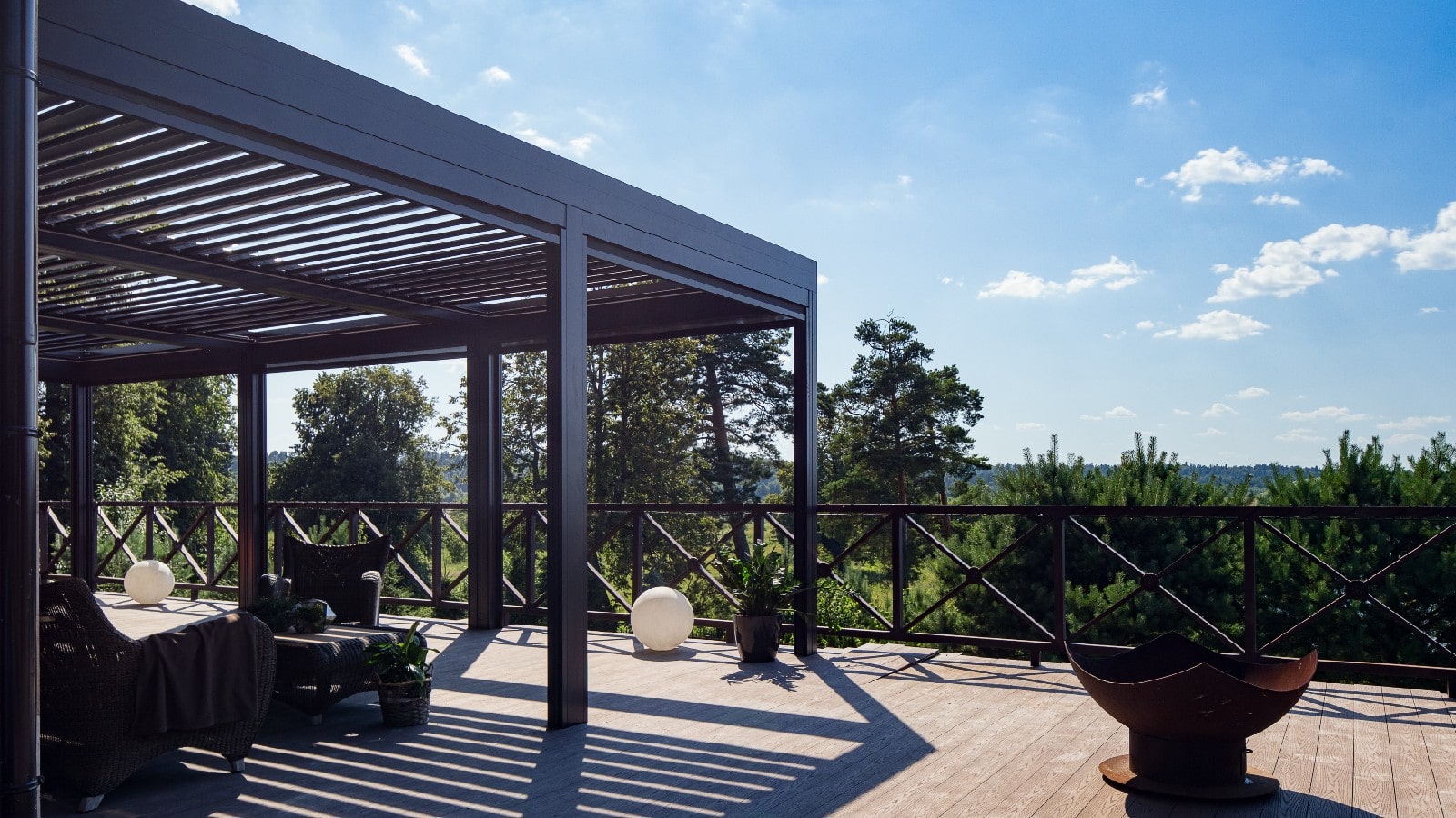3. Механизм управления навесом (его выдвижением или поворотом ламелей — в зависимости от выбранной конструкции перголы) — механический, автоматический (с пульта или через приложение, интегрированное с системой умного дома).