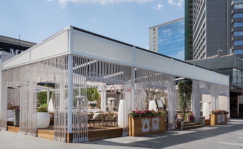 Тентовые конструкции можно также укомплектовать всеми типами изделий для оснащения проемов. Раздвижным или подъемным остеклением для сохранения тепла, а в дополнение — ZIP-системами для защиты от солнца в жаркий период.