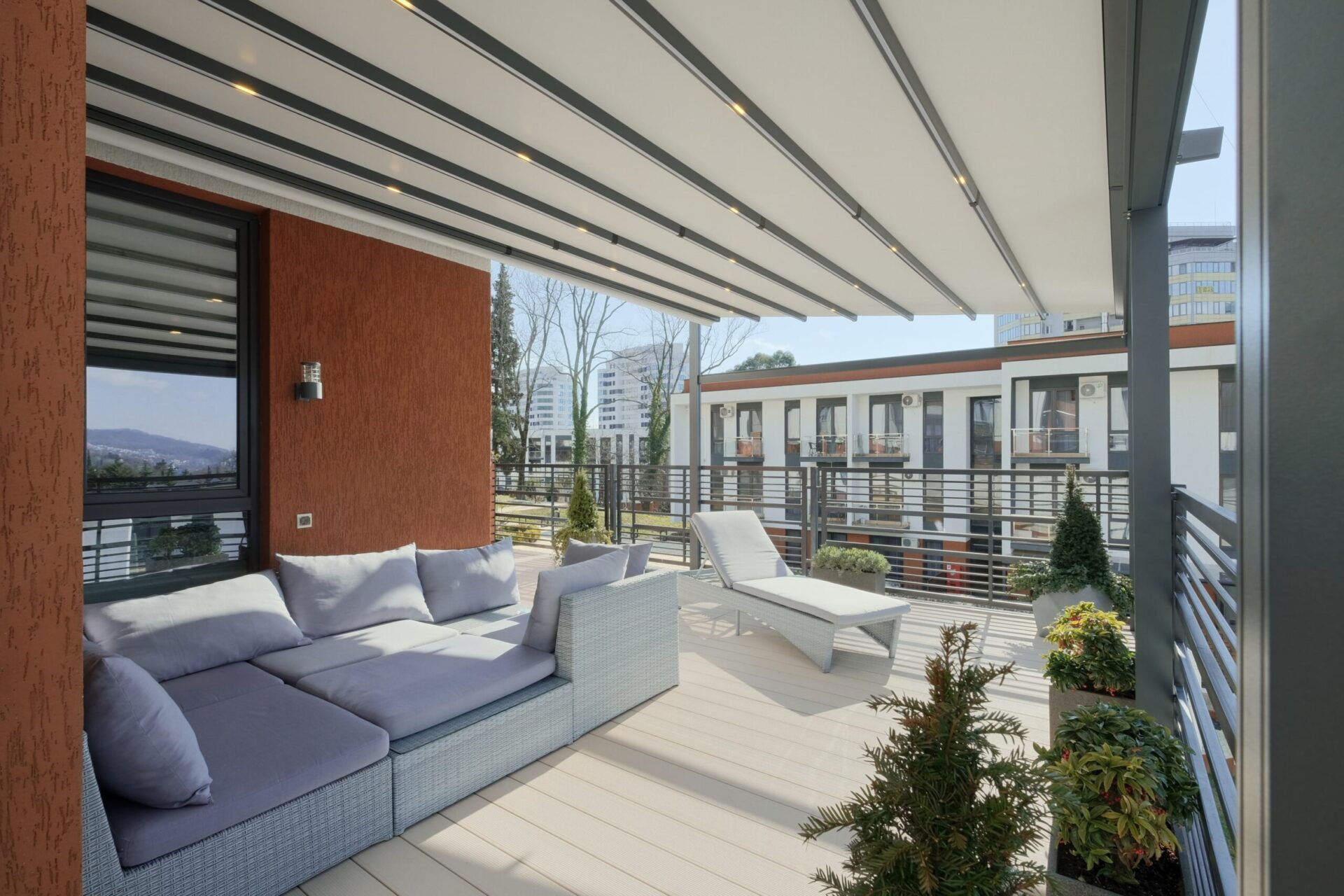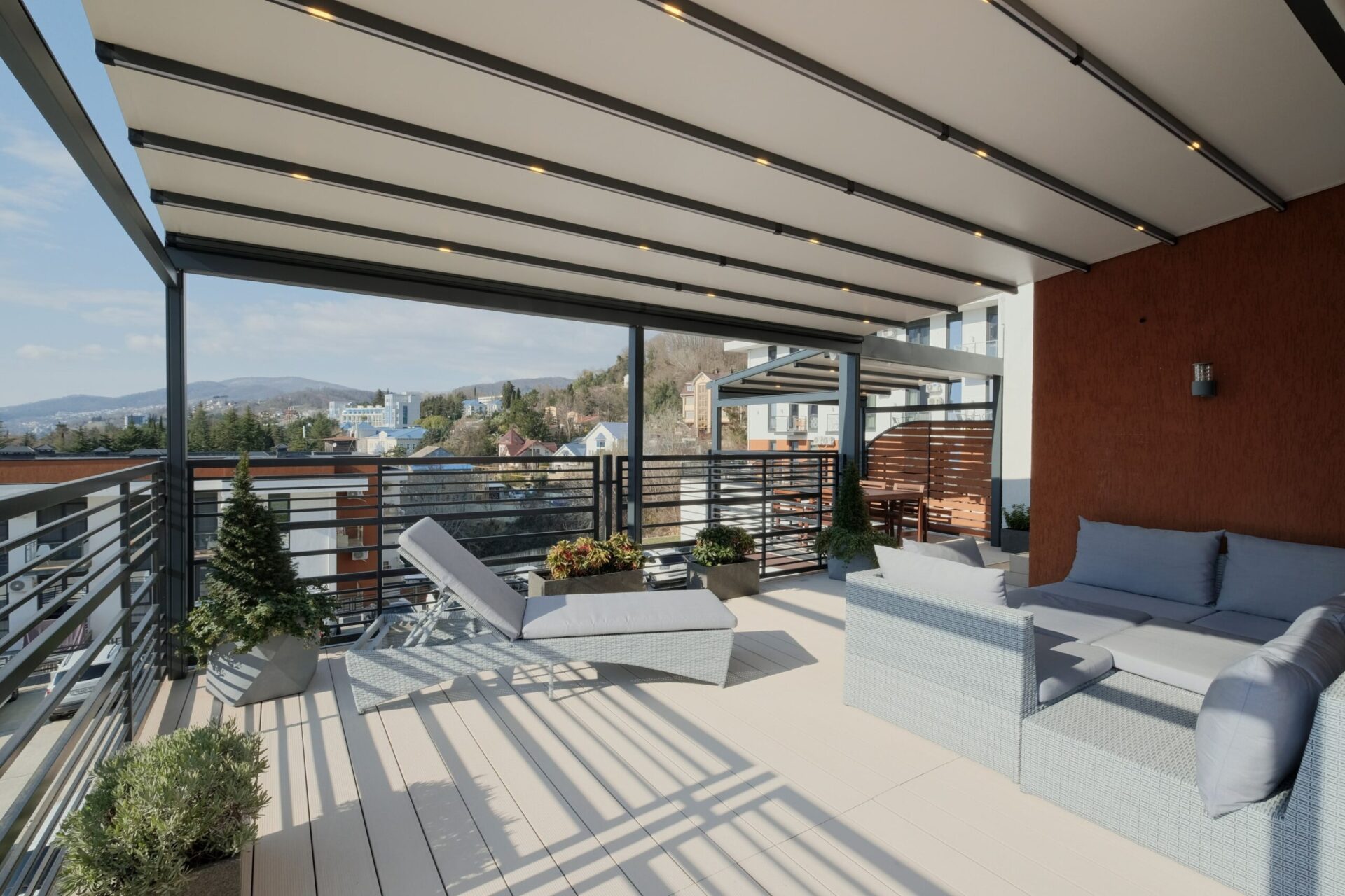 В изделиях CORPSUN предусмотрена встроенная LED подсветка в профилях ребер тента без выпирающих элементов.
